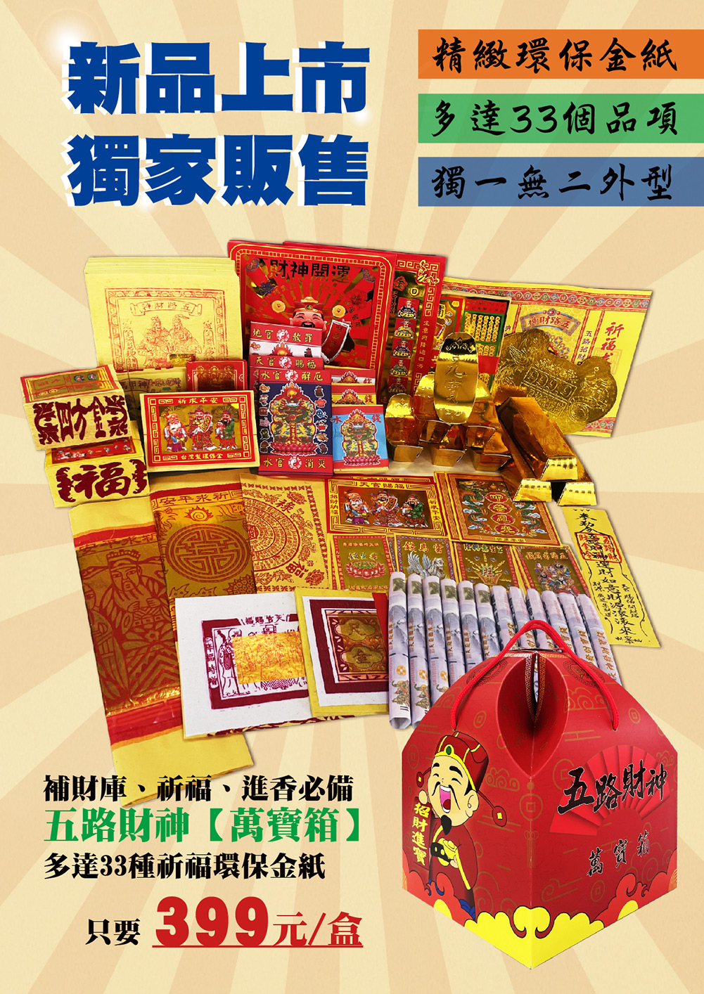 結合傳統信仰與現代設計的「萬寶箱」,多達 33種祈福金紙組合,專為 補財庫、招財運、祈求平安 而設。 外型獨特、攜帶方便,是現代人拜拜最佳選擇! ♻️台灣製造環保材質,誠心不減! 環保金紙材質,減少焚燒污染,誠心祈福的同時也為地球盡一份心力。 一拎即走,超便利! 精巧尺寸設計,拜拜不再手忙腳亂,輕鬆拎著就走,無論是去宮廟、香客大樓、祭祀場所皆方便攜帶。 點選「萬寶箱」購買去