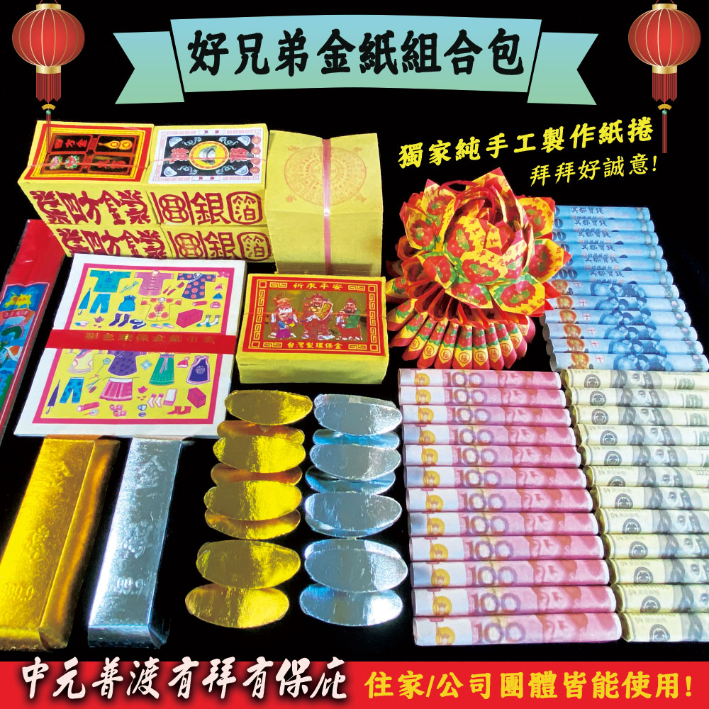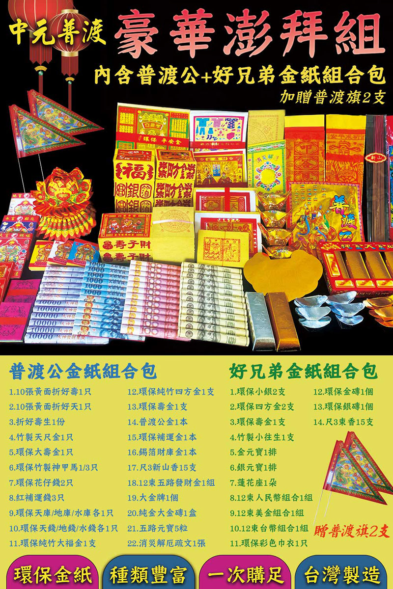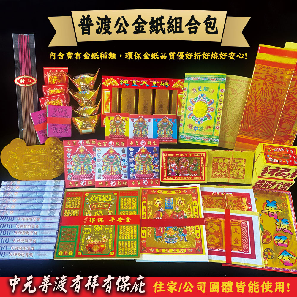 •環保金紙大組合包,含普渡公+好兄弟金紙組合+加贈普渡旗2支 •100%台灣製造金紙,材質佳、易拆摺、易燃燒 •金紙在家也能輕鬆選購,種類齊全、快速省時又便利 •公司行號,宗廟團體經常回購之金紙,歡迎團購批發